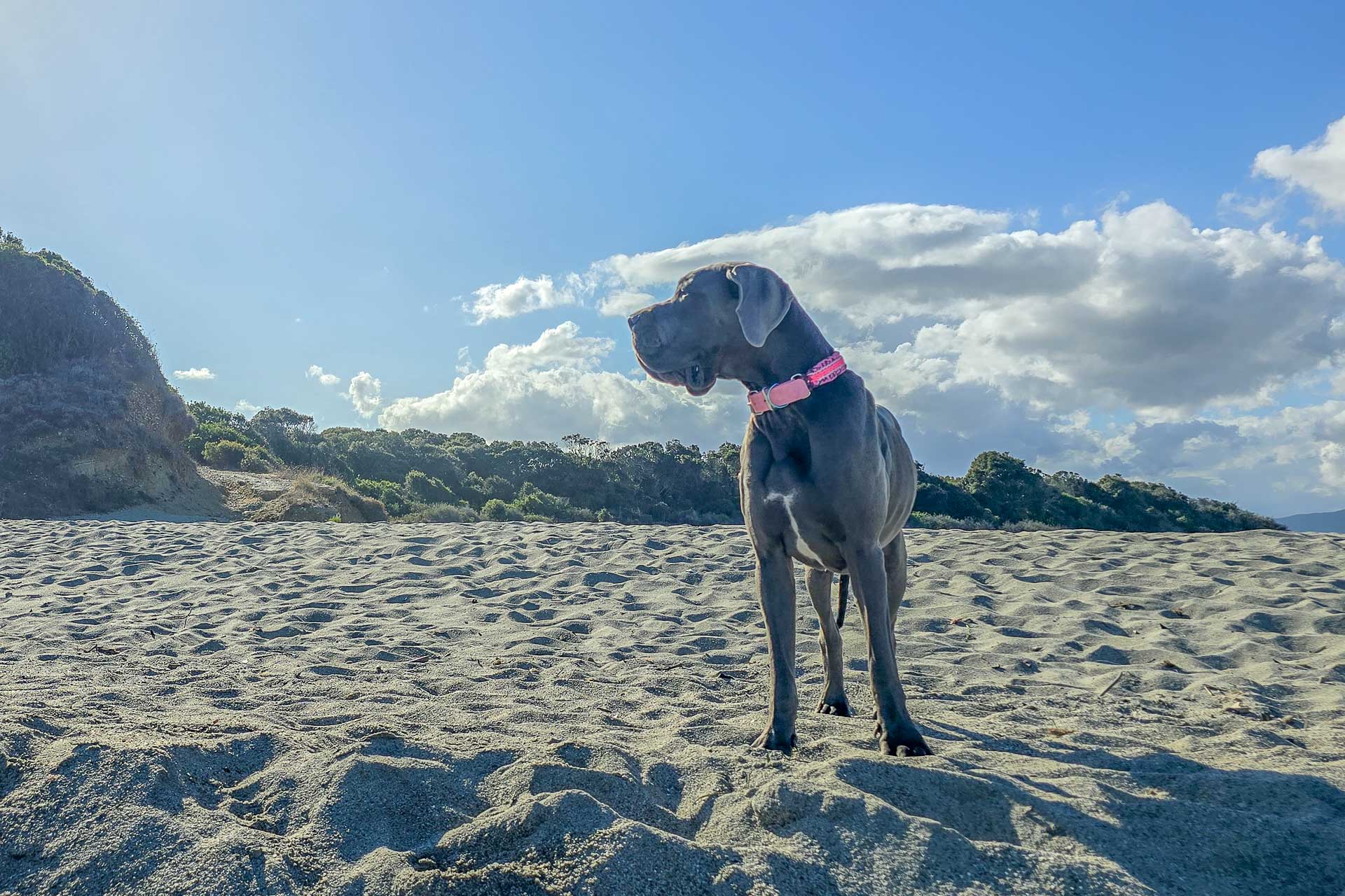 Je suis une dogue allemande née en 2023, 60 kg de tendresse XXL et compagne fidèle de tous les voyages de mes humains.