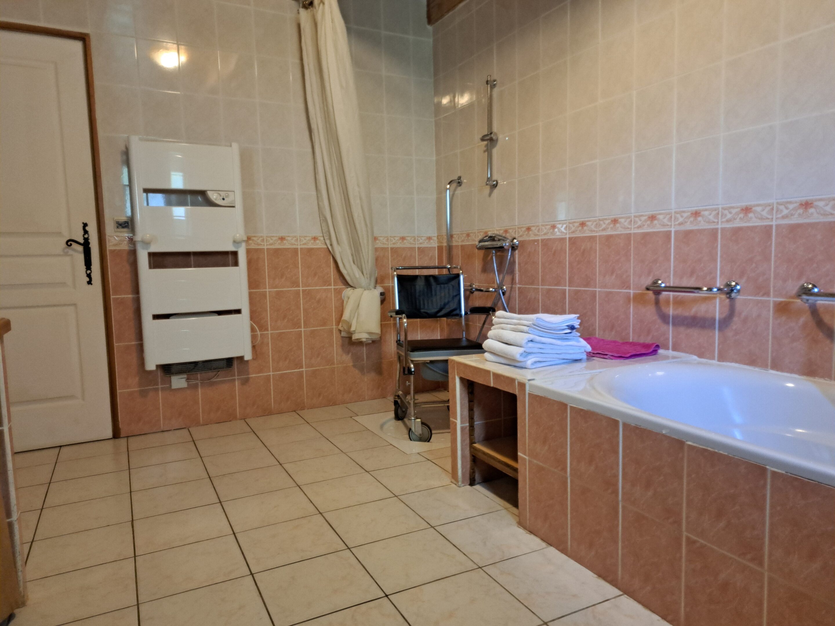 - Salle de bains adaptée avec sièges de douche, poignées, vasques accessibles
