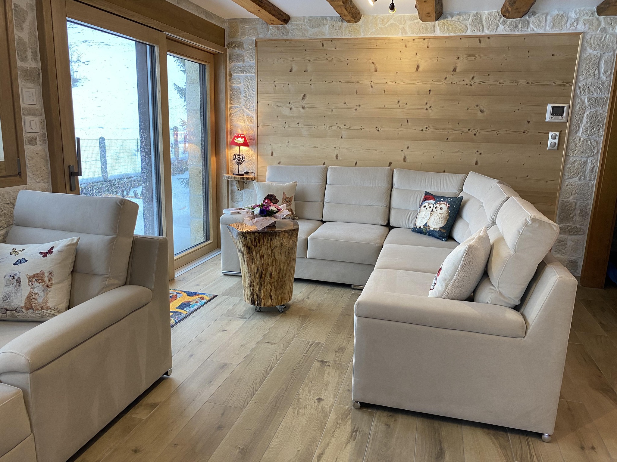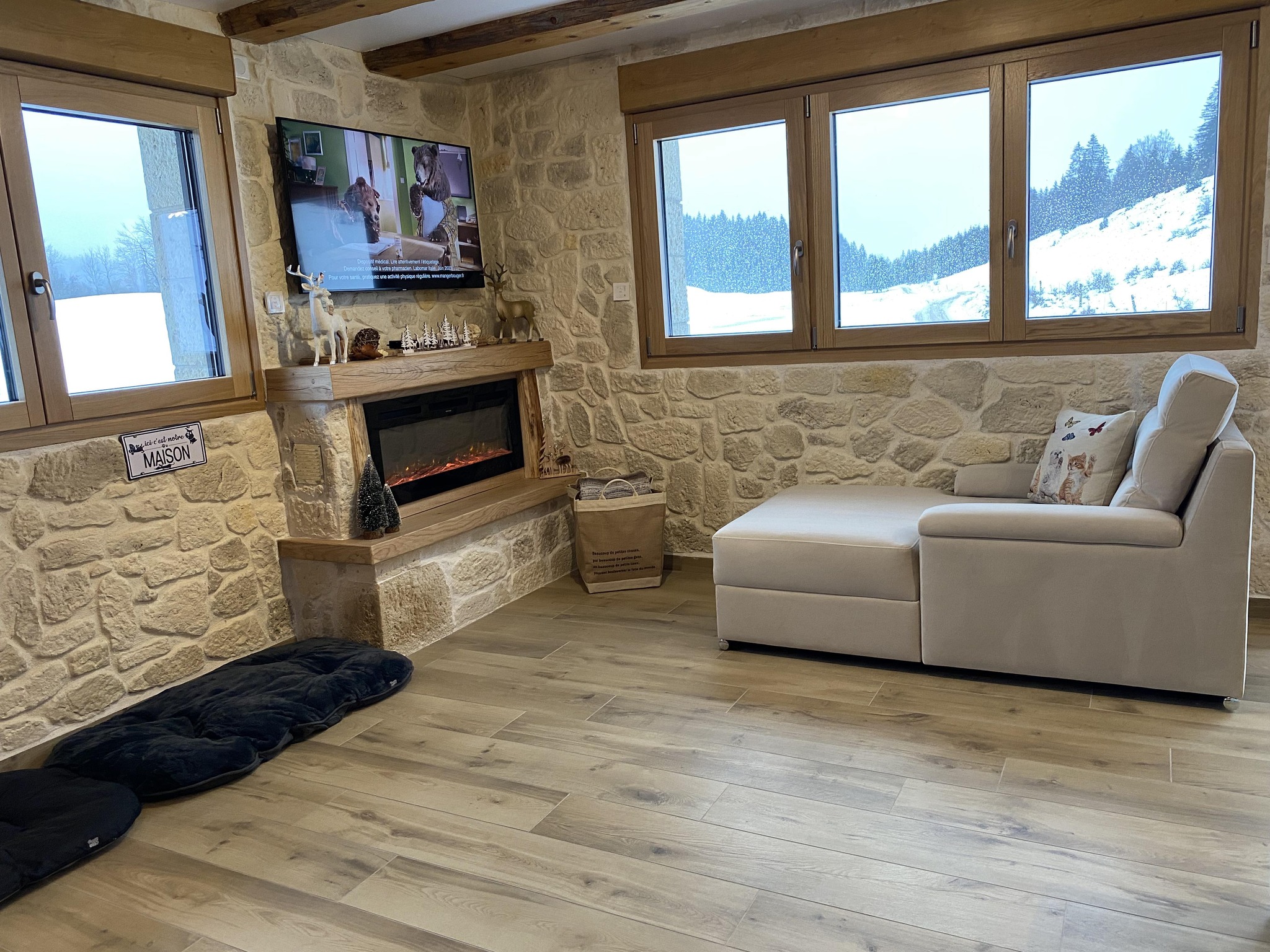 - Salon cocooning avec cheminée, canapé d’angle, table basse artisanale et TV connectée.