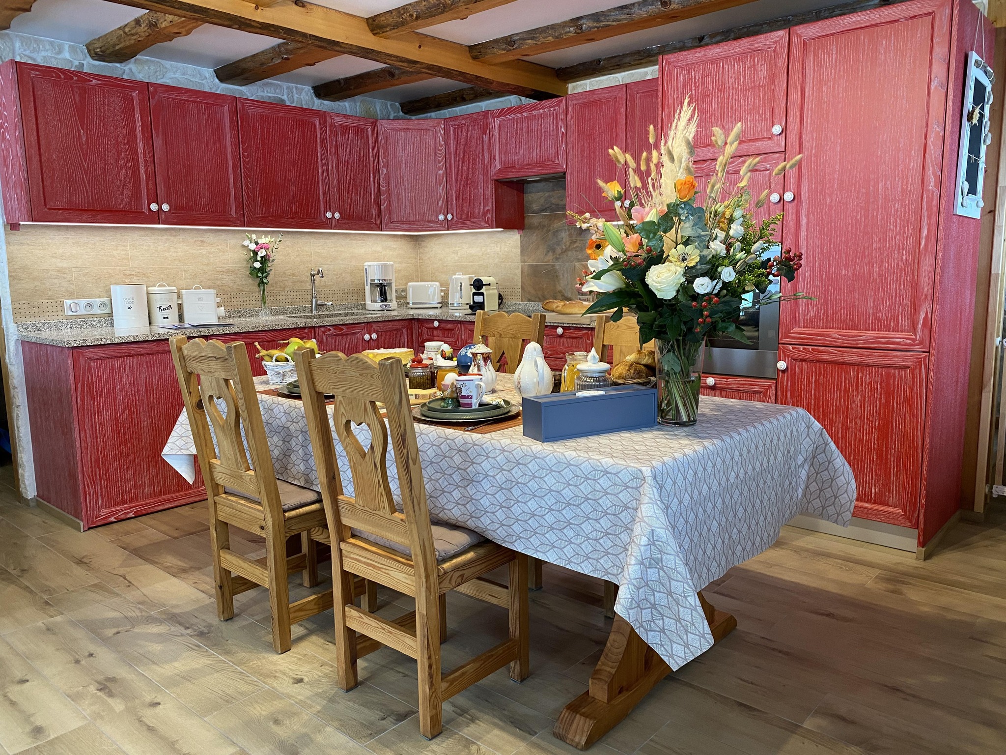 - Cuisine ouverte entièrement équipée : lave-vaisselle, four, plaques induction, micro-ondes, réfrigérateur-congélateur (idéal BARF), Nespresso, cafetière filtre, appareils à raclette et fondue…