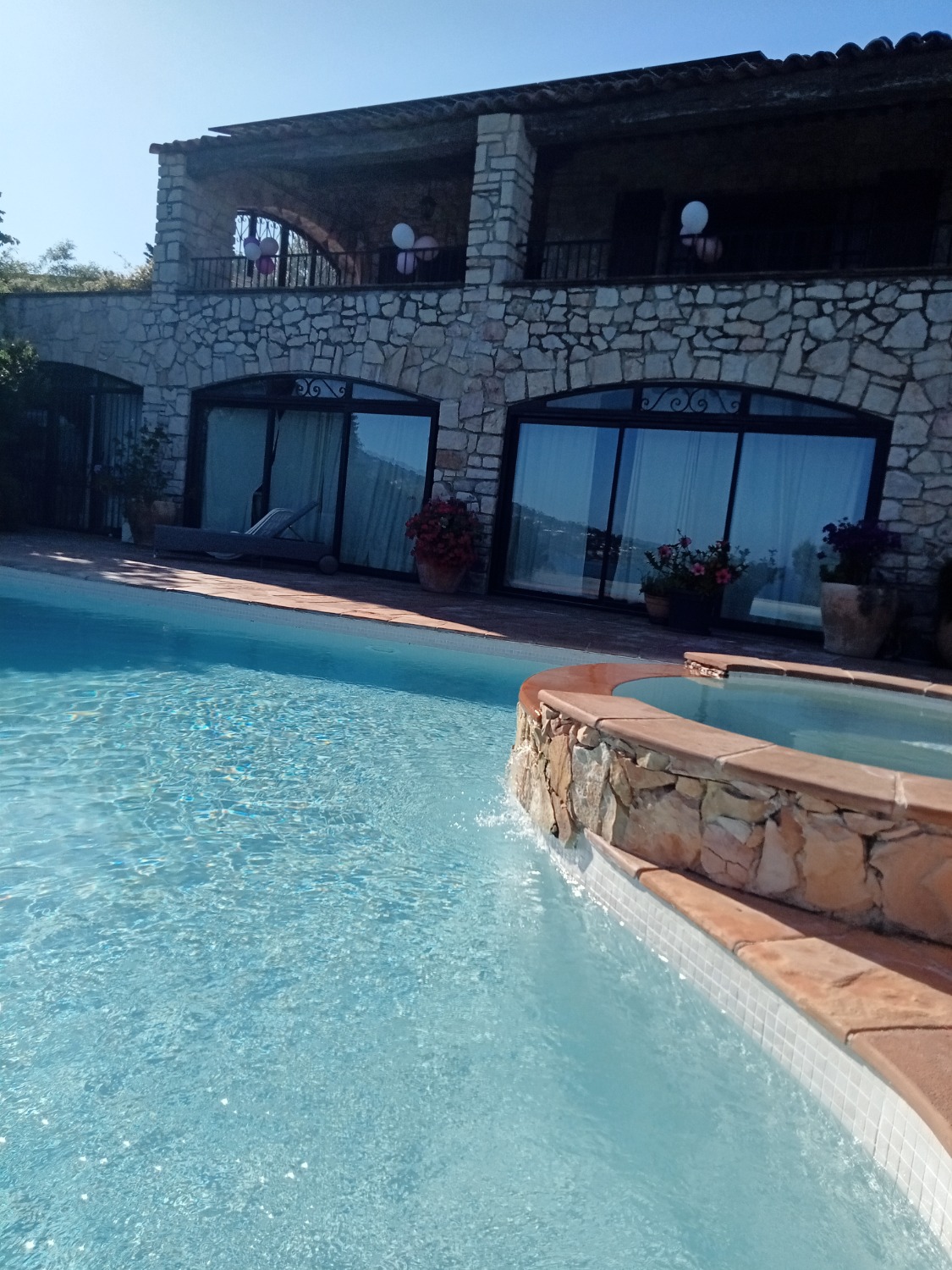 La grande terrasse exposée plein sud est entièrement fermée par une baie vitrée, sécurisée pour les enfants et les animaux qui ne peuvent pas accéder seuls à l’escalier menant à la piscine.